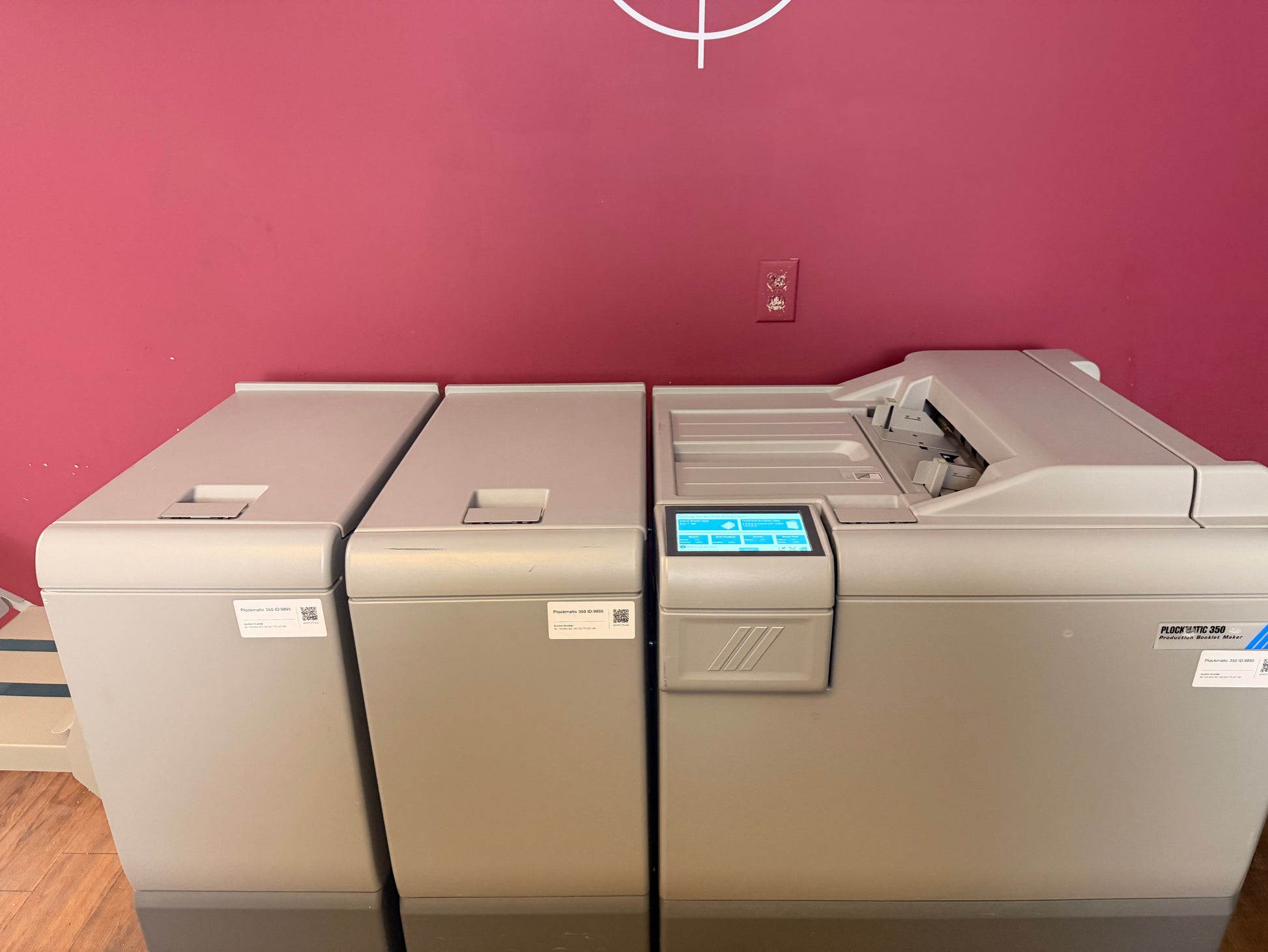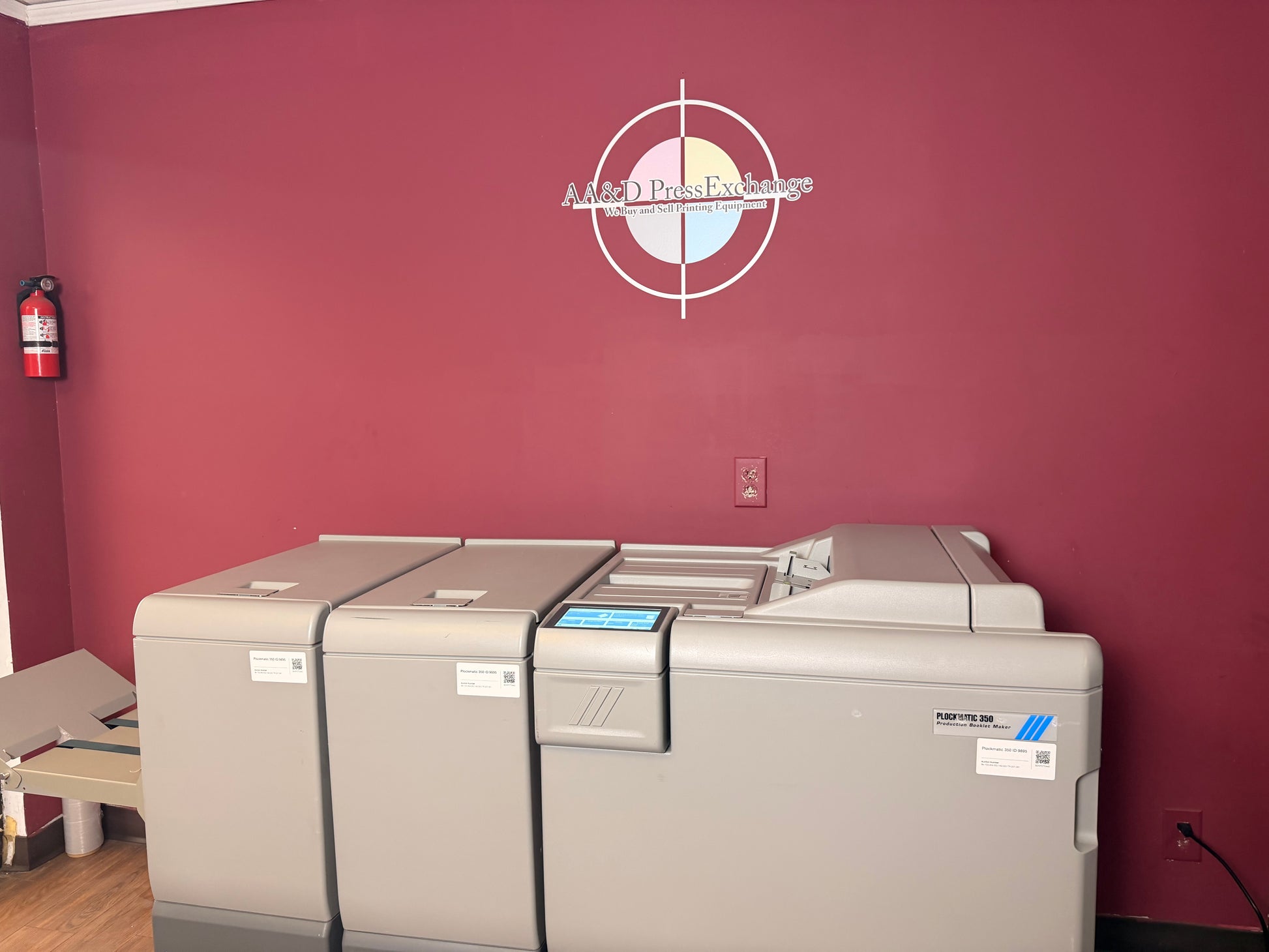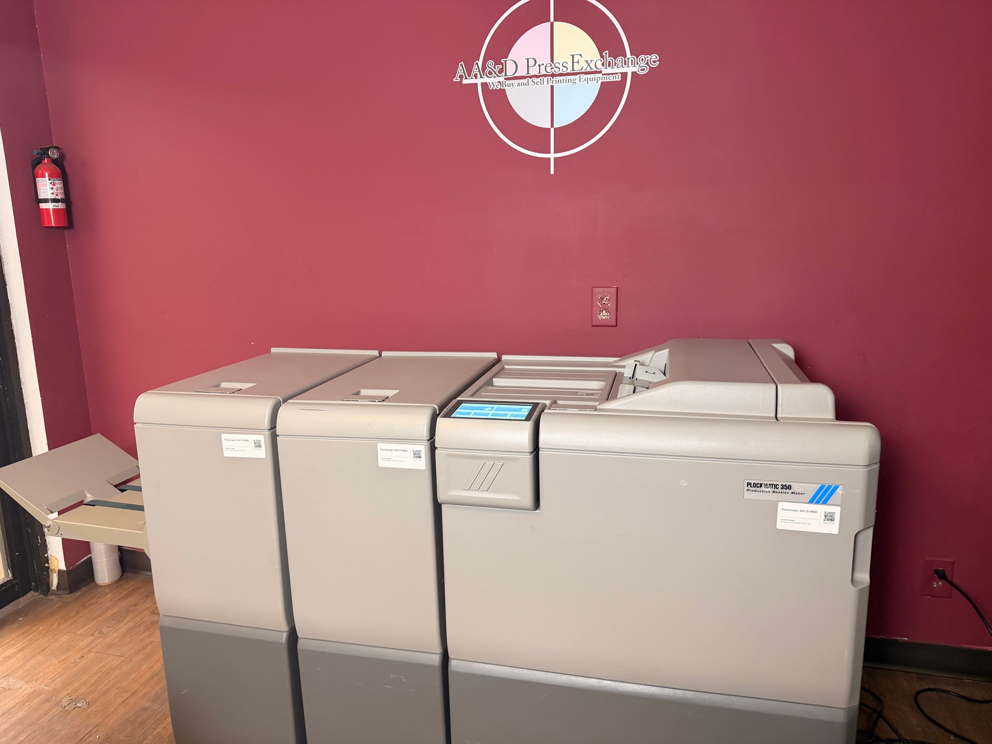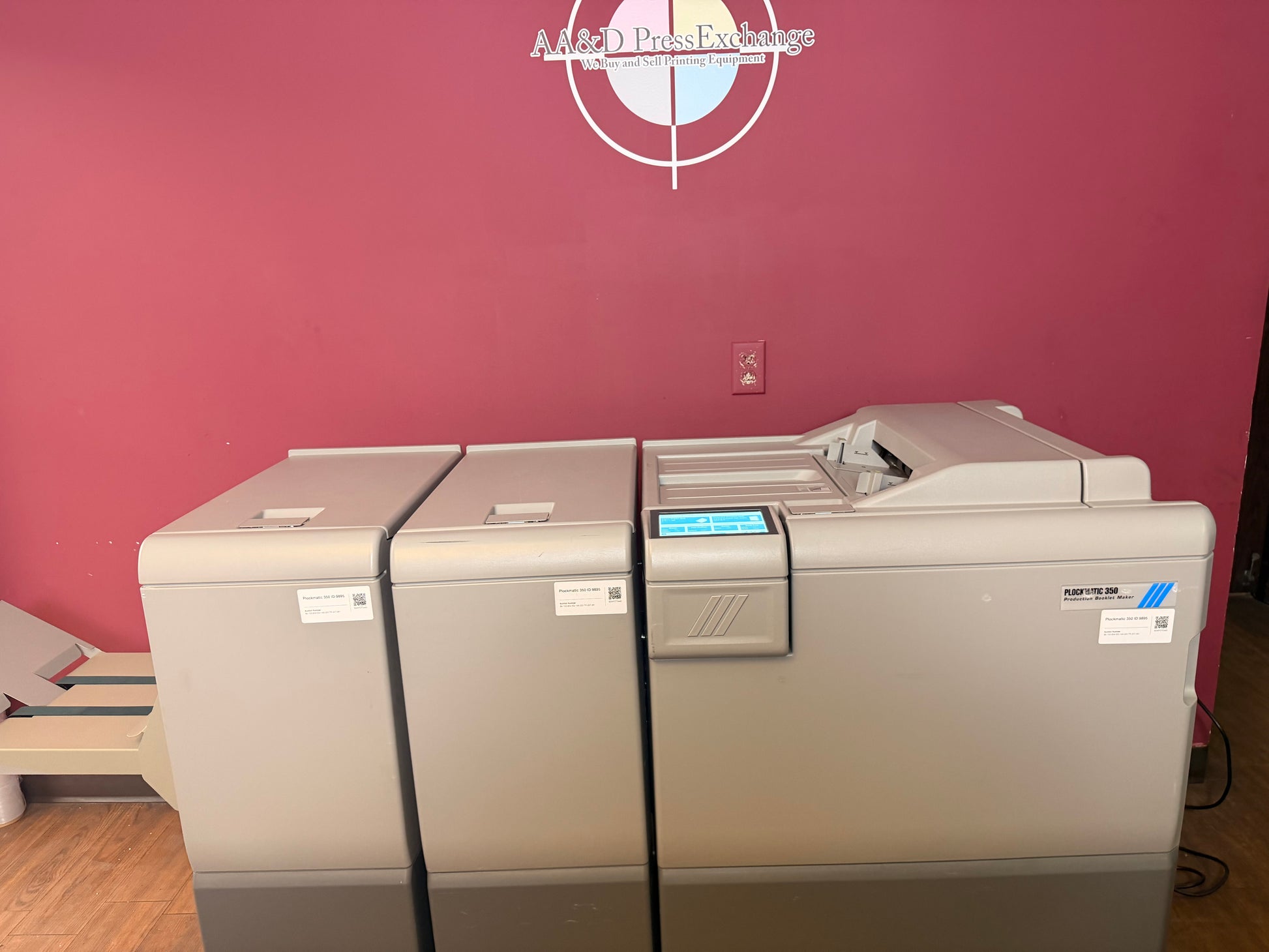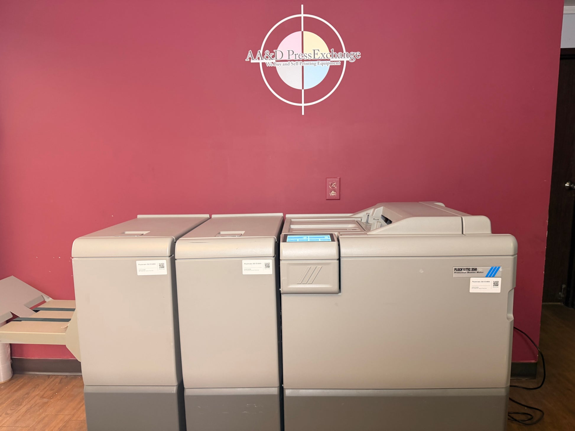 We are now offering a 30-day warranty on all electronic parts for our Plockmatics. AA&D PressExchange can help crate or palletize this item and also help arrange shipping to your location. !!FREE CRATING!! CONTACT US FOR VIDEO! Bookletmaker - 154,000 Squarespine - 149,020 Trimmer - 207,061 Booklet Maker Speed Maintain engine speed* *Actual speed depends on number of sheets per booklet Standard paper sizes A4, A3, B4, 8.5x11”, 8.5x14”, 9x12”, 11x17”, 12x18”, SRA4, SRA3, Custom size possible Paper size (min) Width 206 mm / 8.1” Length 275 mm / 10.8” Paper size (max) Width 320 mm / 12.6” Length 457.2 mm / 18” Paper weight uncoated (min) 64 gsm / 16 lb Bond Paper weight coated (min) 105 gsm / 28 lb Bond Paper weight (max) 300 gsm / 110 lb Cover* *350 gsm/132lb Cover supported on some media Set size (stapled folding) 2-50 sheets PBM500, 2-35 sheets PBM350 (80 gsm / 20 lb Bond) Set size (non stapled folding) 1-2 sheets Offline use Yes Noise emission 62dB Rotate, Crease, Bleed Trimmer module Paper sizes Same as Booklet Maker Minimum trimming 5+5 = 10 mm / 0.39” Maximum trimming 30+30 = 60 mm / 2.36” Asymmetrical trimming Yes Face Trimmer module Paper sizes Same as Booklet Maker Minimum trimming 1 mm / (0.0394”)* *When trimming SRA3 (450 mm) Booklets minimum trimming is 5 mm, when trimming 18" Booklets minimum trimming is 9 mm. Maximum trimming 25 mm / (0.984”) The Trimmer support “multi-cut” operation. This allows customers to create a 105 mm/4.35” long booklet cut down from a larger sheet size. BookFold module Paper sizes Same as Booklet Maker Set size (stapled folding) Same as Booklet Maker Power source From Booklet Maker Paper sizes Same as Booklet Maker Paper weight (min) 64 gsm / 18 lb Bond Paper weight (max) 250 gsm / 93 lb Cover Cover Feeder capacity 20 mm / 0.79”: Approx. 200 sheets of 80 gsm paper or approx. 200 sheets 20 lb Bond paper Power source From Booklet Maker The Cover Feeder dimensions are included in the Booklet maker dimensions and will not add to the footprint. Stacking capacity Up to 1000 A4 / 8.5x11” sized booklets of 4 sheets Note: These specs have been taken from the manufacturer's website for a brand new item. There may be mention of optional accessories/supplies, which may or may not be included with the used item actually being sold here. There may have been improvements in production specifications between the used item's date of manufacture and brand new items. To be clear, you are bidding on the item in the photographs, not the item described in the manufacturer's latest literature or description below. If there is no link to the video of the item you are bidding on, we have not tested the machine. Our testing does not go any further than what is shown in the video. Minimal Inspection done. |