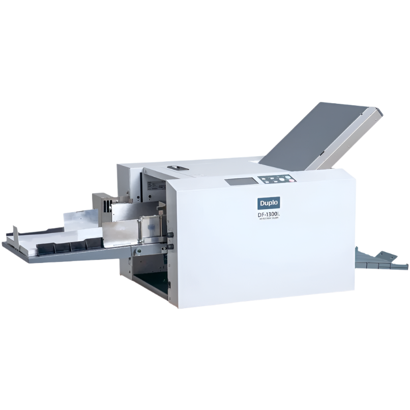 he DF-1300L is positioned between Duplo’s friction feed paper folders for the office market, and SRA3 format suction folders commonly found in small commercial printers. Combining the compact footprint and ease-of-use automation of its lesser brothers, together with air suction feeding essential for handling digital print, the DF-1300L complements the growth in features and print quality of entry level presses, that have brought new levels of affordable production to in-house and small digital print shops. It is the ability to handle ‘Long A3’ format banner sheets that makes this product unique in its class, allowing marketing departments and small print production sites to stretch their creativity and variety of applications they can produce.