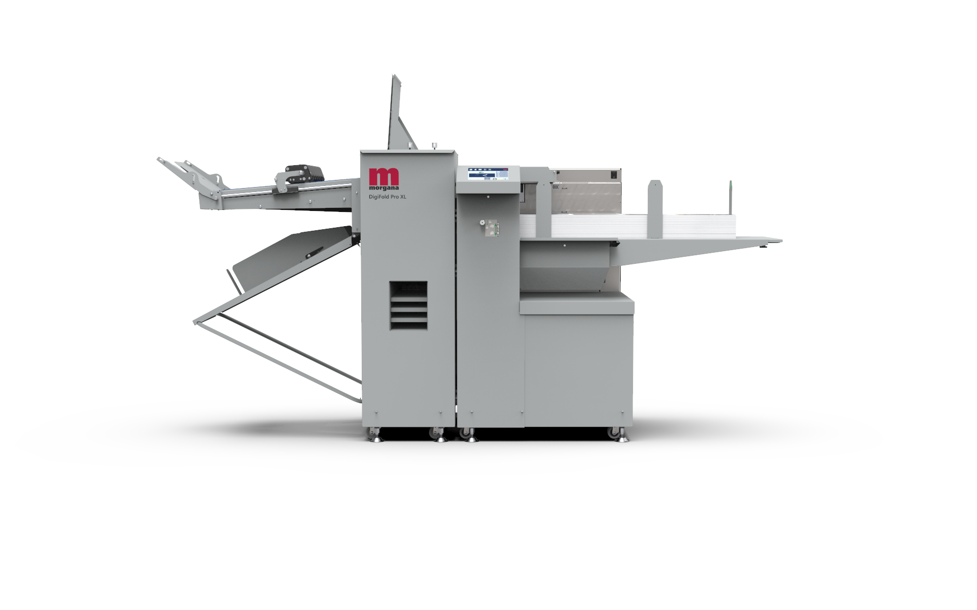The Morgana DigiFold Pro XL is the latest addition to the DigiFold family. Developed on the well proven Morgana DigiFold Pro, built with our unique, open design, suction feeder that handles stock sizes from 210 – 1300mm / 8.3’’ – 51’’ in length. This heavy-duty automatic creasing and folding system is designed to complement mid to high volume digital and offset production presses.