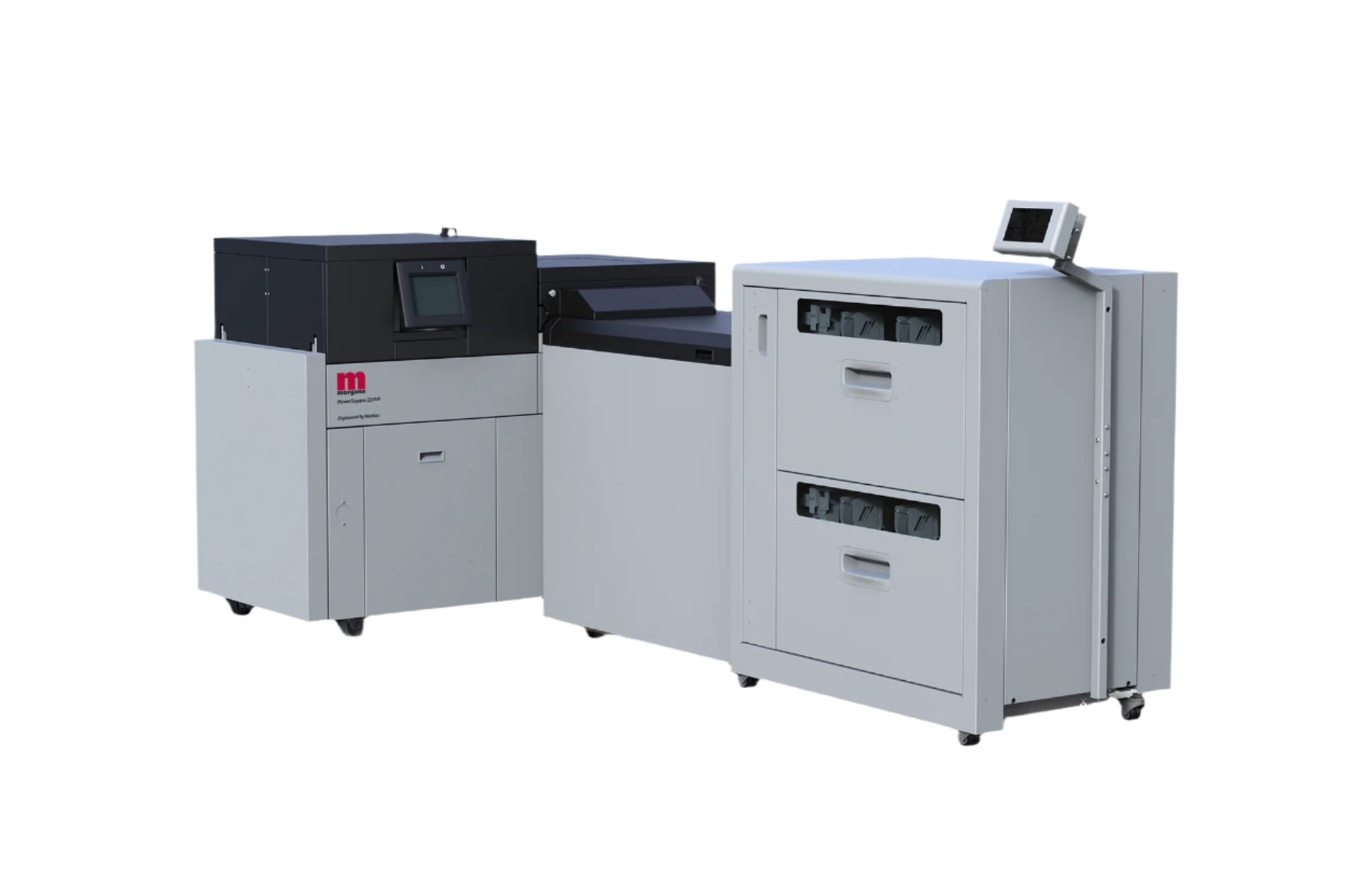 The Morgana PowerSquare™ 224VF booklet maker with its high capacity dual bin feeder offers a flexible solution for a wide range of booklet types and sizes. The system is fed by the VFX vacuum assisted feeder which has a loading capacity of up to 540mm / 21″, giving long uninterrupted production runs. Pre-collated sets can be placed into both bins for longer runs, or covers can be placed into one of the bins when they need to be merged with collated sets. The feeder can also be loaded on the run with automatic bin switching.